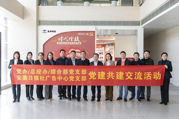 3月10日,安徽日?qǐng)?bào)社廣告中心黨支部書記、廣告中心主任、安徽傳媒信息廣告公司總經(jīng)理王學(xué)菊一行到訪東華科技,與黨委辦公室/總經(jīng)理辦公室/綜合管理部黨支部開展黨建共建交流活動(dòng),并參觀了“時(shí)代楷模”邱軍同志先進(jìn)事跡陳列室。公司黨委副書記、紀(jì)委書記桑艷軍出席活動(dòng)。