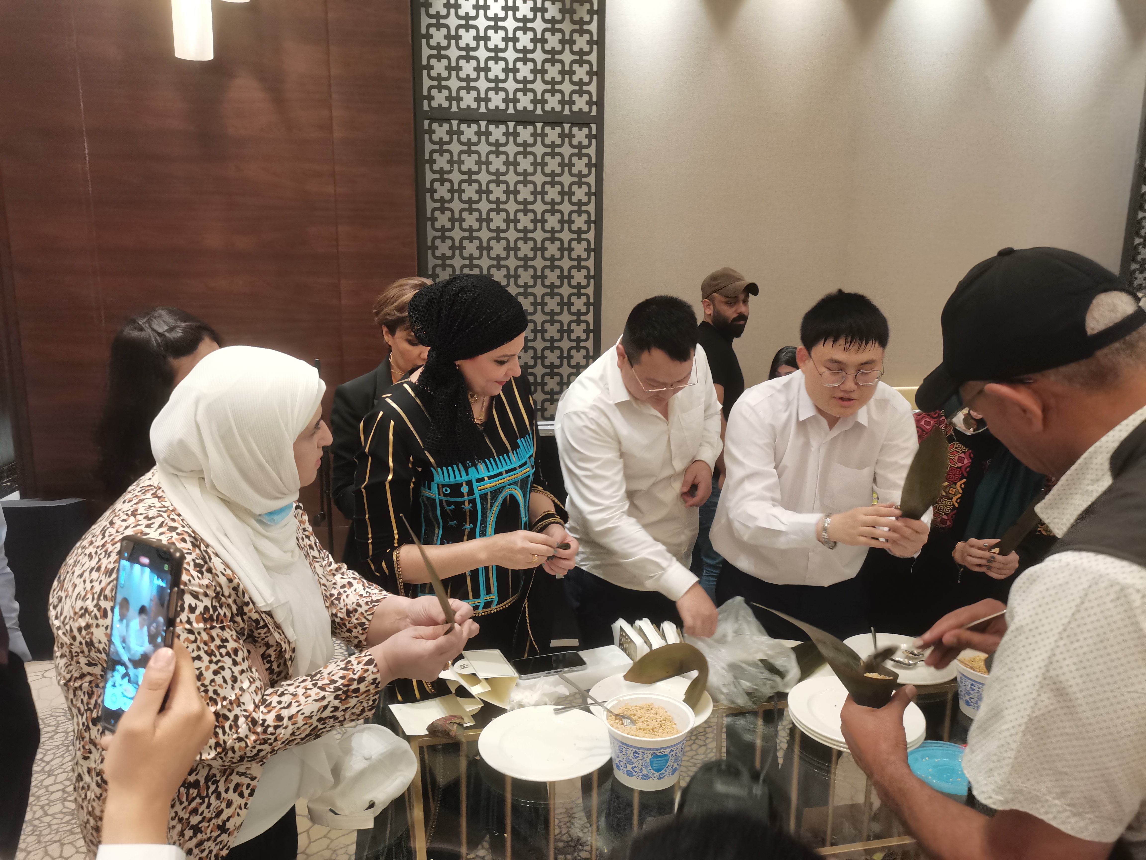 晚會期間,伊拉克朋友們為屈原的愛國情懷所打動,并和在場的中國人學起了端午節美食粽子的制作方法。